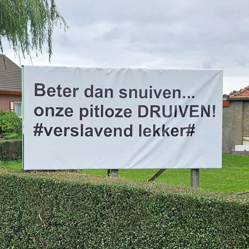 Het spandoek met de winnende leus blijkt al een paar seizoenen in Zuid-Limburg te bewonderen. “We hangen het spandoek op in het druivenseizoen”, vertelt winnaar Hélène Kremer van Boerderijwinkel Akkerhof. “Onze druiven zijn gewoon superlekker, daar kan je gewoon niet vanaf blijven. ‘Ze zijn verslavend, zo lekker. Je kan beter verslaafd zijn van druiven dan van drugs’, merkte een medewerker eens op. Zo is de slogan ontstaan. Niet zozeer dus met een link naar de drugsproblematiek in de omgeving, hoewel sommigen die link vast zullen leggen.”